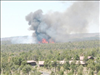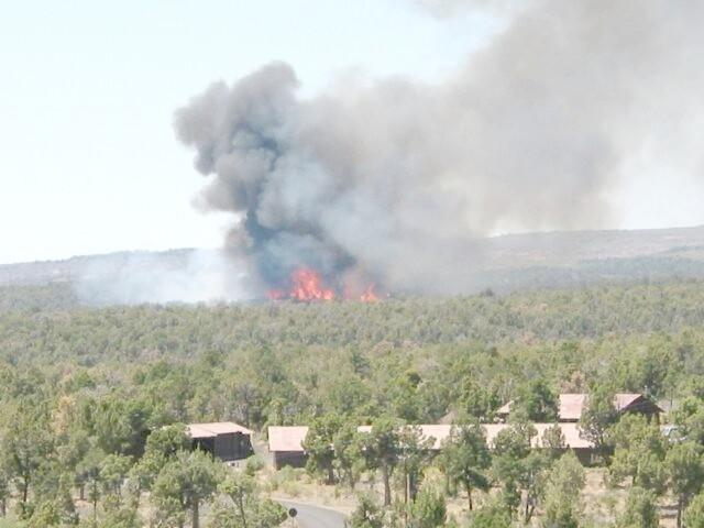 Full fire with black smoke advancing on buildings on the first day of Long Mesa Fire, Mesa Verde National Park, July 29, 2002