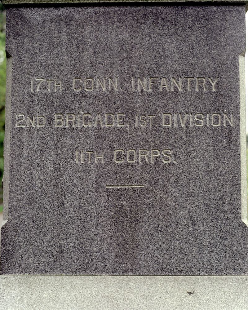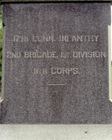 1 of 8 mns to Conn. troops in Gettysburg Campaign. Marks the position held by the regiment on July 2 when attacked by the Confederate Early's Division. Located on W side of Wainwright Av., near its N end. || 3 part base w/1st part rough-hewn & 5'3" sq. Smooth cut shaft, 2'3" sq., is adorned with excised state seal & incised inscriptions on E face. All 19'9" high.
