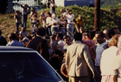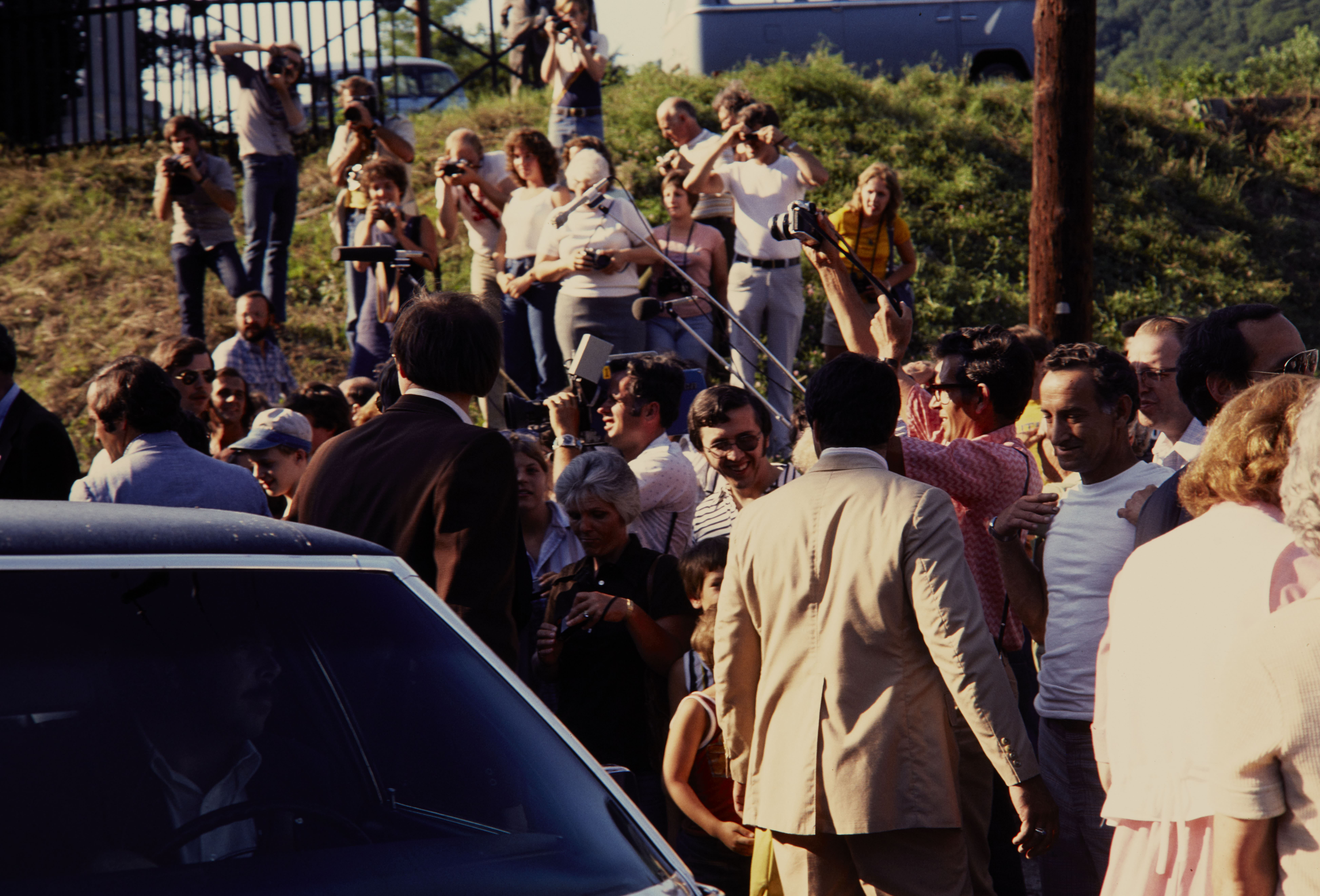 First Lady Rosalynn Carter and Mrs. Frances Allethea "Allie" Murray Smith standing near a car and surrounded by secret service agents and civilians in Historic Downtown Harpers Ferry, West Virginia.