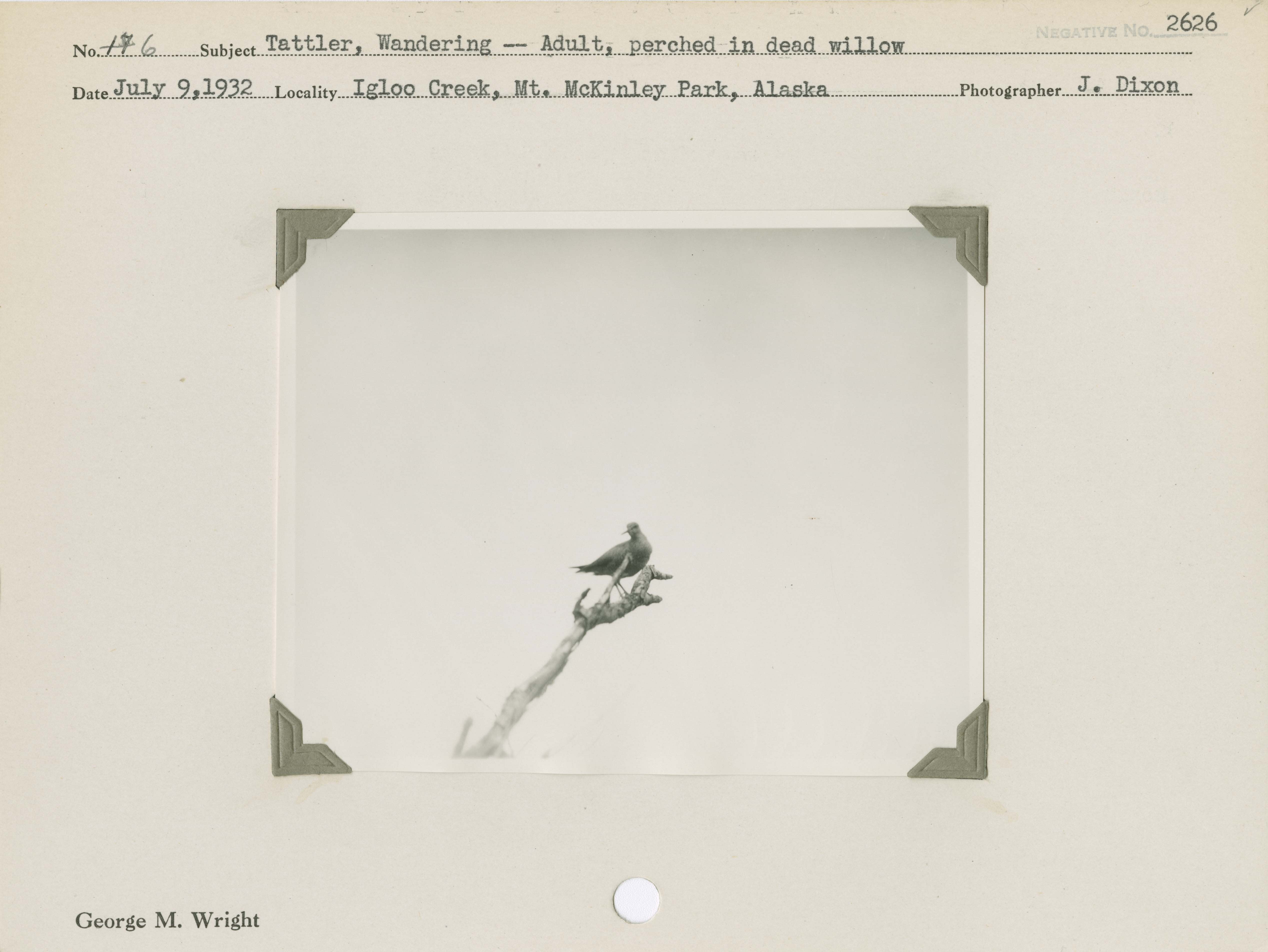 Tattler, Wandering -- Adult, perched in dead willow. Locality: Igloo Creek, Mount McKinley [Denali] National Park, Alaska. Negative #: 2626.