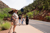 A woman wears a tan volunteer outfit and wide-brim hat while standing next to a road. Behind her, a group of young women walk along the asphalt. They carry bottles of water while hiking up the large, sandstone canyon.
