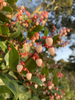 Dozens of light pink flowers blooming on a bush. The flowers hang from woody red stems in a zigzag pattern. The petals of each flower are fused, making them appear as little bells. On the closest red flower stem, hang six flowers, each with red sepals. Lightly curled leaves branch off from below the woody red stems. The leaves are veined, smooth and some glistening in the sunlight.