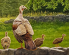 A painting of a mother turkey standing on a stone wall with three other small baby turkey standing alongside.
