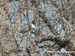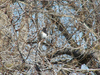 In the center of the photo is a small bird with a black head and neck, a white breast, and a brown and grey back and tail. It is perched in a jumble of thin tree limbs with larger limbs in the background.