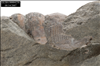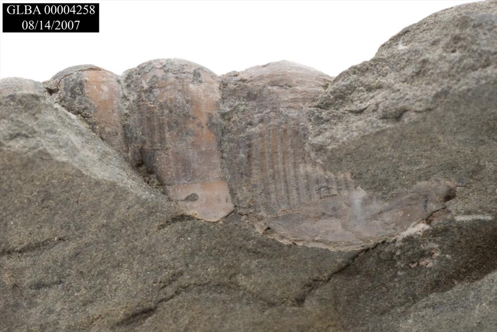 Fossil of gastropod in rock.