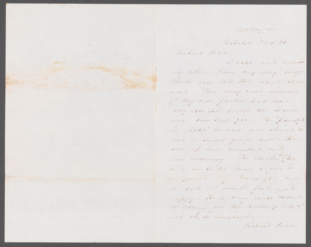 “6th day eve Waterloo 3 mo 31 Richard dear I have just received thy letter. I am [ ] sorry George should have told thee what Sarah wrote – Thee may rest assured if thy dear Father had not very soon got better thee would have been sent for – The ‘paralytic stroke’ he had was slight & now he seems quite well. He was up here & made a call this morning. The Doctor said he would be better than be it [appeared]. If Burroughs was as well I should feel quite happy - He is very sick indeed – no change for the better yet. I feel oh, so anxious – Richard dear I think of thee often & that it must be exceedingly lonely for thee. Thee must try & keep up good spirits – It is but a short time before thee will come home. I cannot write more I am almost sick – May our heavenly Father enable me to give thee better news of Burroughs before long – With much love thy Cousin Lizzie”