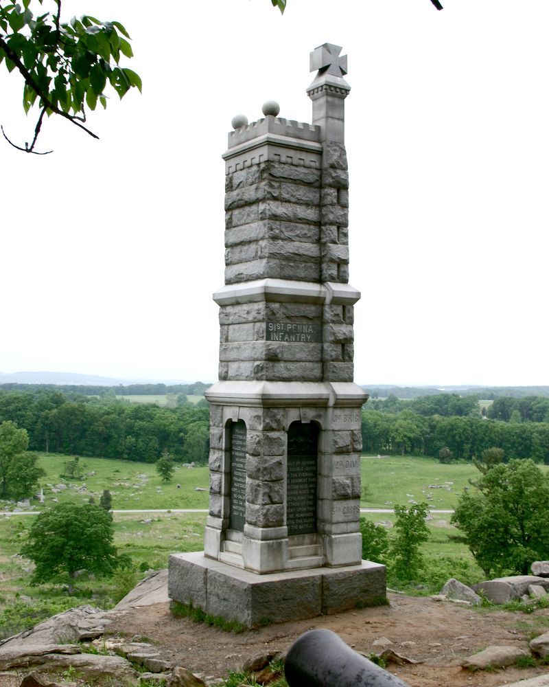 Marks position held by 91st Pennsylvania on July 2 and 3, 1863 when supporting Battery D, 5 US on the crest of Little Round Top. 1 of 110 mns in Park to Pennsylvania commands in Gettysburg Campaign. Located on summit of Little Round Top at overlook. || Mn & 2 flanks markers. Castellated tower w/ 3 tiers of block courses. Base, 7' square. Shaft, 5' square. All 25'6" high. 3 inset panels w/ inscriptions. Tower topped w/ Corps Maltese Cross. Flank marker, flat topped, 1'x1'x1'6". Bronze seal missing.