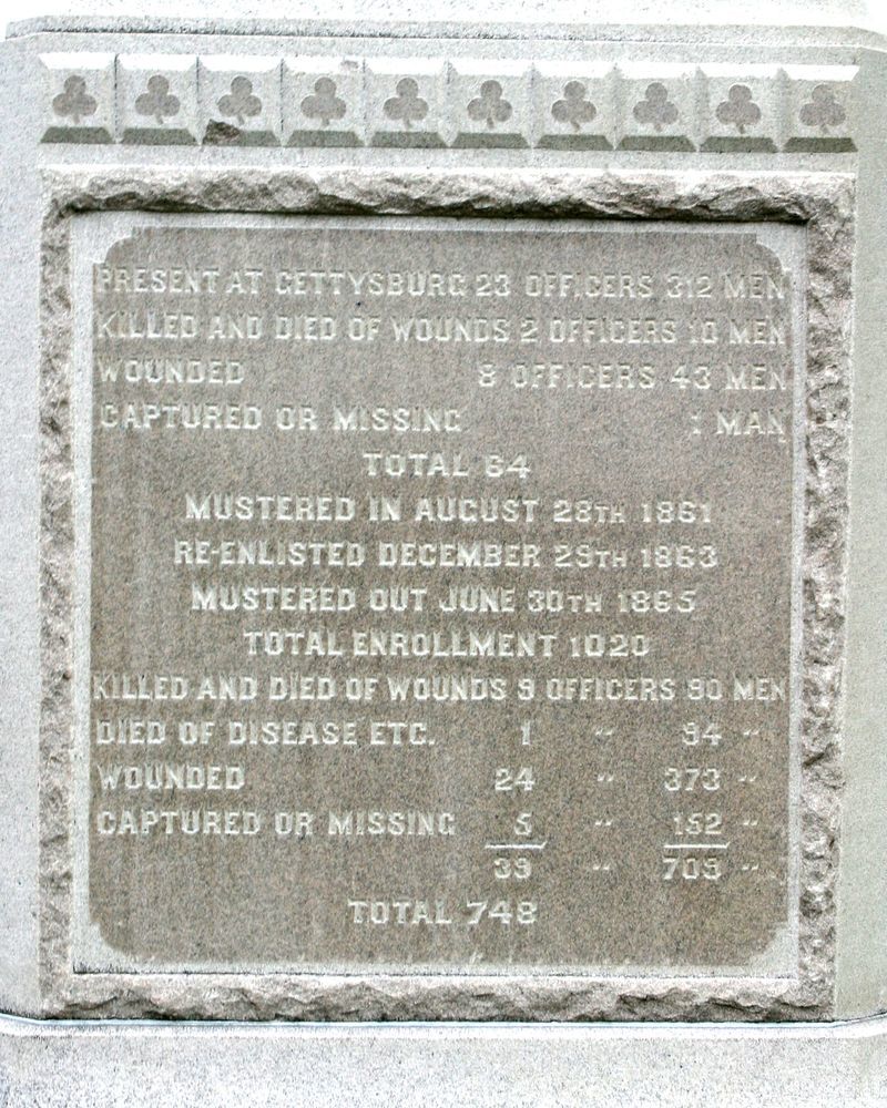 1 of 110 Monuments to Pennsylvania. Indicates advance position of 106th PA Infty Jul 3, 1863. LF&RF mark brigade line pos, 79'&72' from Mn, E side of Hancock. Mn, W side Hancock. Position Marker on E Cemetery Hill, shows held position July 2. || MN, LF&RF & Position Marker. MN: base 5'11"sq, 3 part shaft w/ bronze tablet & bas-relief, top of haversacks & drums (trefoil Corps symbol shape). All 12'4"H. Pos. Mkr 2'6"x1'x3'3"H, Inscrip faded, badly stained. LF&RF 10"sq x1'H.