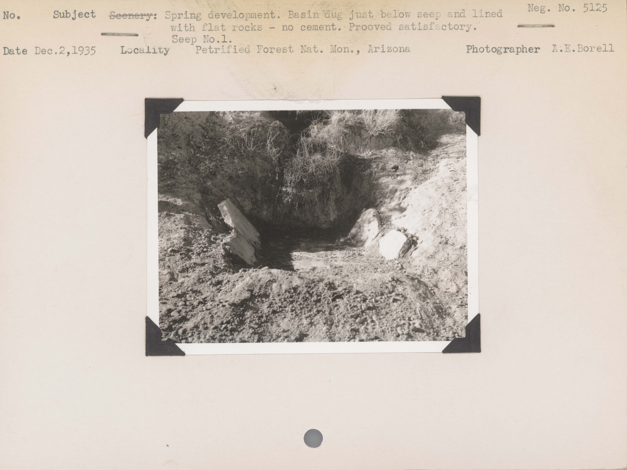 Springs development. Basin dug just below seep and lined with flat rocks – no cement. Prooved satisfactory. Seep number 1. Negative #: 5125. Locality: Petrified Forest National Monument, Arizona.