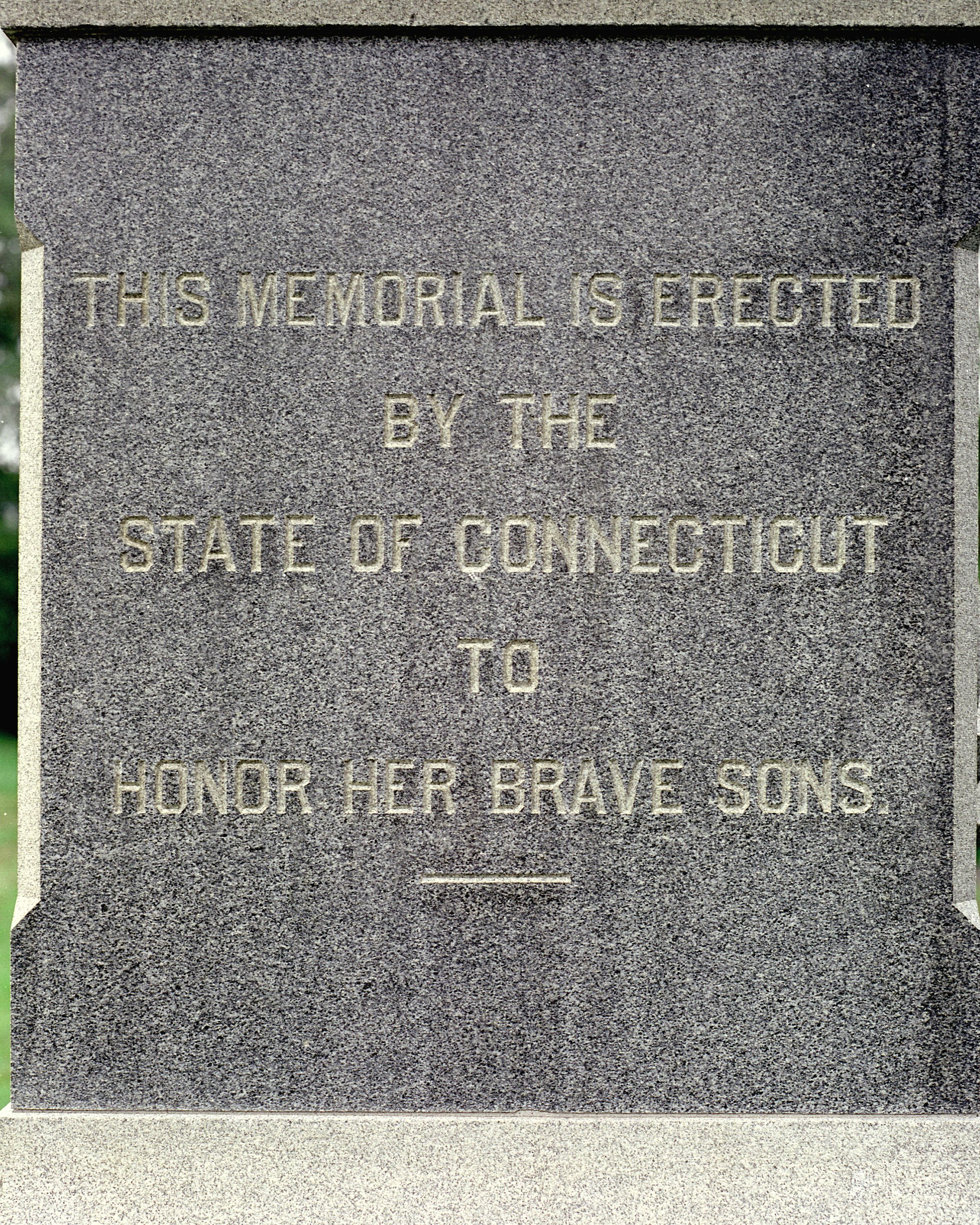1 of 8 mns to Conn. troops in Gettysburg Campaign. Marks the position held by the regiment on July 2 when attacked by the Confederate Early's Division. Located on W side of Wainwright Av., near its N end. || 3 part base w/1st part rough-hewn & 5'3" sq. Smooth cut shaft, 2'3" sq., is adorned with excised state seal & incised inscriptions on E face. All 19'9" high.