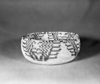 Mrs. Donald Segerstrom Collection. Object: Paiute basket. Dimensions: 13 x 8 1/2". Materials: sedgeroot, bracken fern, redbud, willow. Technology: interlocking stitch, overstitched rim worked opposite direction, fag ends trimmed on work face, moving ends t