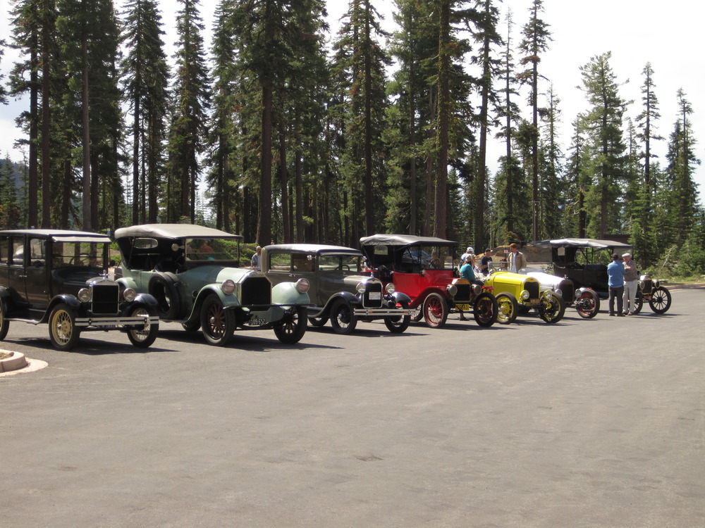 A line of antique cars in the Kohm Yah-mah-nee Visitor Center parking lot during the Antique Auto Club Tour.
