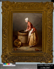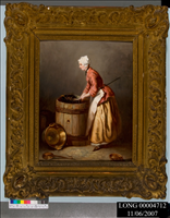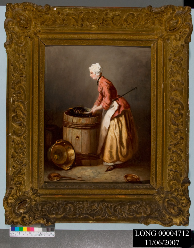 a: COPY OF CHARDIN "THE SCULLERY MAID". YOUNG GIRL FACING PROPER RIGHT, WEARING WHITE CAP, RED TUNIC, TAN SKIRT, WHITE APRON. FIGURE SCOURING LONG-HANDLED SKILLET OVER LARGE BARREL. LARGE BRASS KETTLE LYING ON SIDE ON FLOOR W/ SKIMMER IN FRONT. BOWL ALSO ON FLOOR AT LOWER RIGHT CORNER. GRAY BACKGROUND W/ BARREL AT LEFT.<CR<CRb: OGEE-MOLDED GESSO AND GILT WOOD FRAME ORNAMENTED W/ FOLIATED C- AND S-SCROLLS.