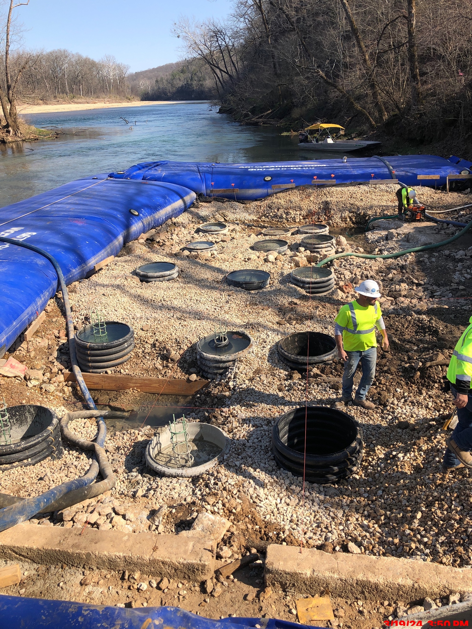 Holes for foundation pilings are drilled into the riverbed and filled with concrete to make a solid foundation for the structure.