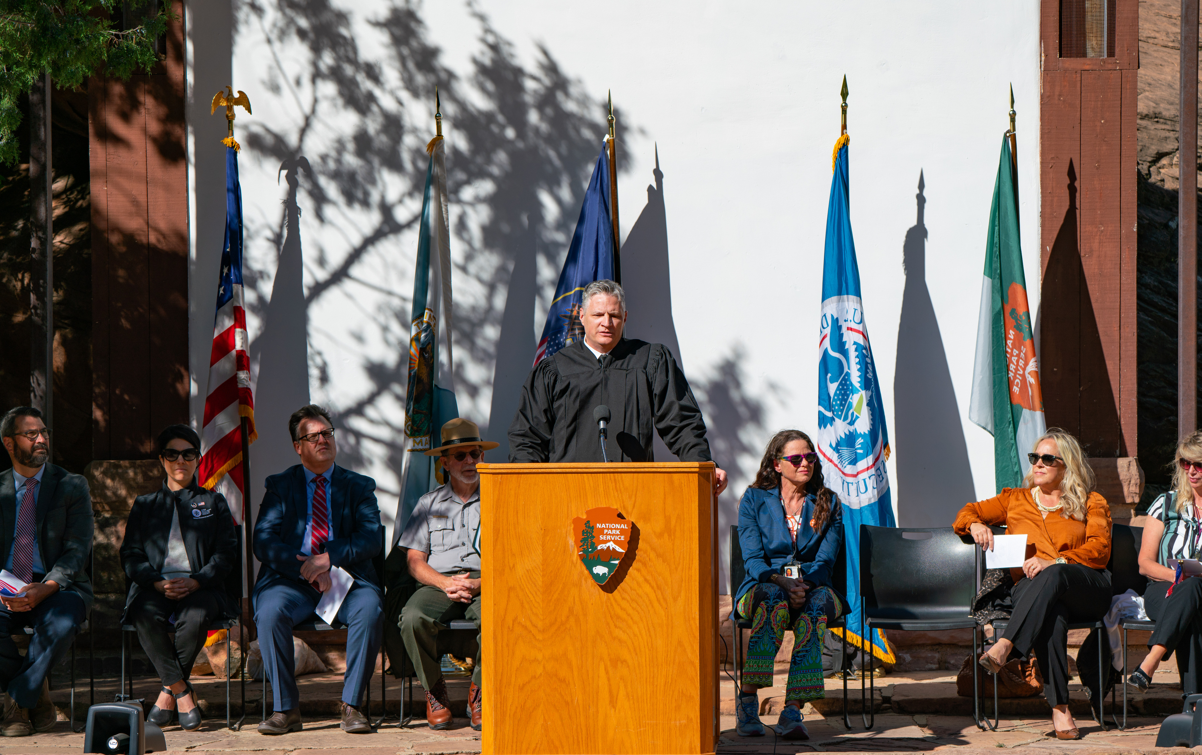 A man in black robes standing on a stage behind a podium with the NPS arrowhead on the front. Behind him sits a group of people. Multiple flags sit behind them all.