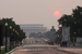 A red sun rises over Arlington Memorial Bridge, which leads to the Lincoln Memorial.