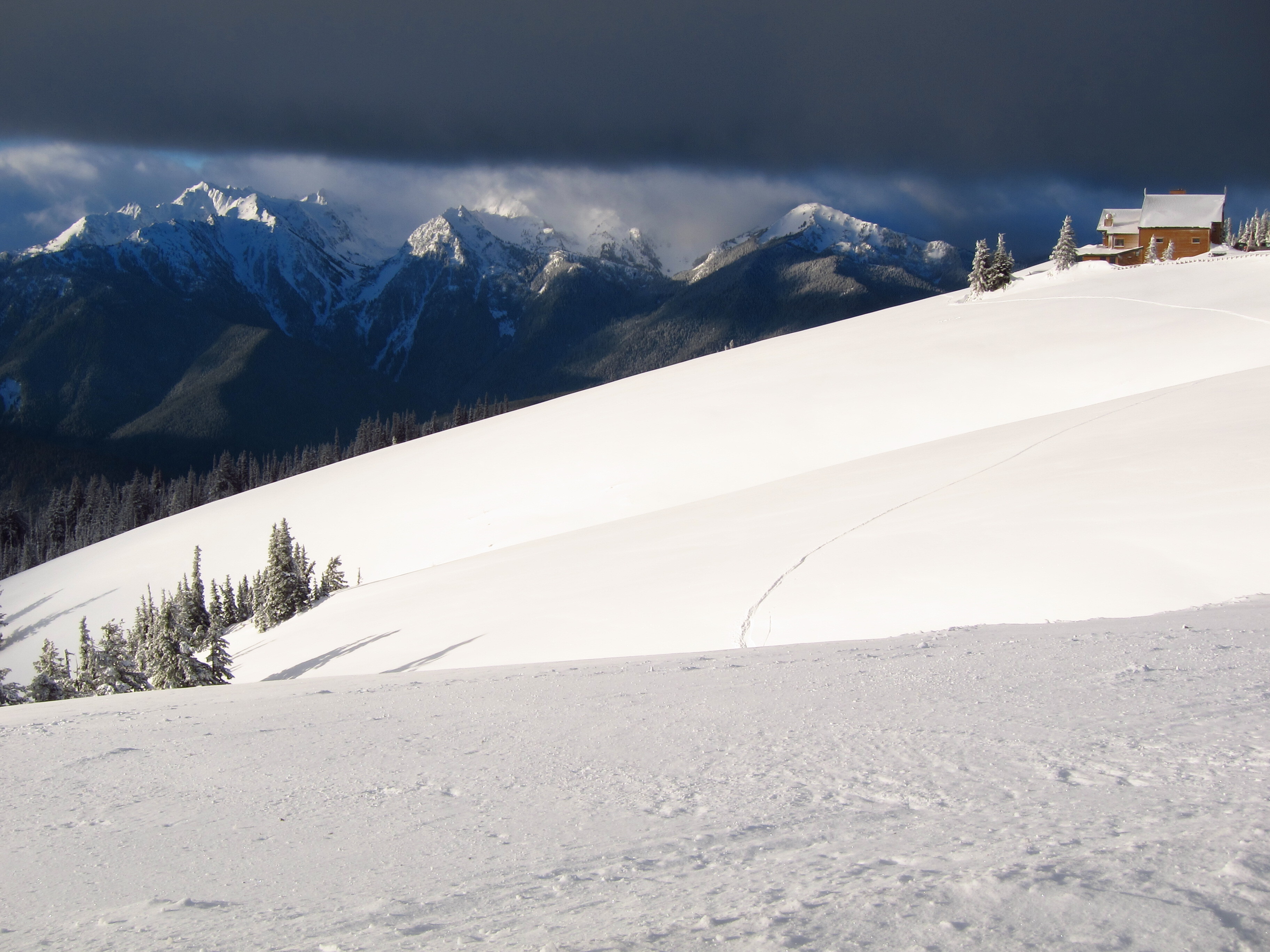 A snowy hillside and a building perched below dark clouds. Snowy mountains visible in the distance.