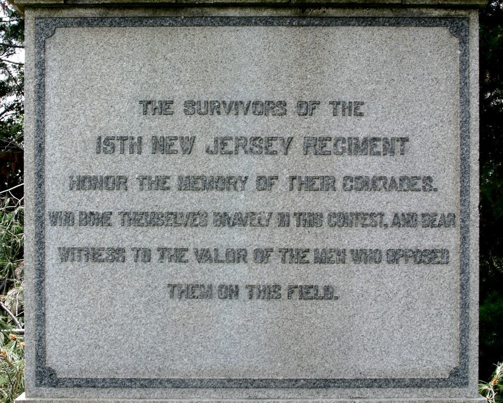 Erected to commemorate service of the 15th Reg. New Jersey Volunteer Infantry commanded by Col. Wm. H. Penrose. Troops were engaged for 2 hours at this line May 3,1863. Rededicated May 16, 1964 by NJ Gov. Richard Hughes. || Mn & marker. Mn: 30'H w/ square base having polished raised lettering & carved rifle relief, 10' polished column, & 3' crowning supporting 7' statue of soldier. Rough-cut dededication mrkr, 1'6"Hx1'8"Wx10", bears bronze plaque on polished face.