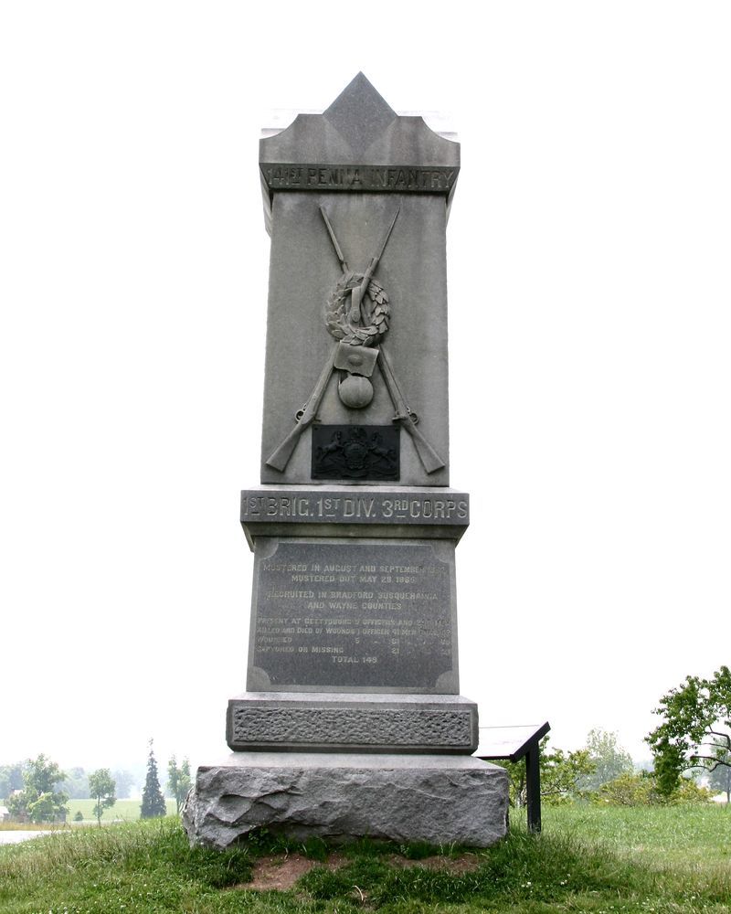 1 of 110 mns in Park honoring the services of Pennsylvania commands in Gettyburg Campaign. Marks position held by 141 Pennyslvania on July 2, 1863. Located at Peach Orchard on S side of Wheatfield Rd, E of Emmitsburg Rd. || Mn & 2 flank markers. Rough-hewn base, 5'6" sq, shaft 3'11" sq, 14'4" high. Polished panels w/ inscriptions. Relief of infantry accoutrements & bronze state seal tablet on N side. Cross-gable cap. Flank markers, 1'x1'x1'6", apex tops w/ insciptions.