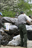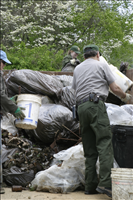 RiverDay is an an annual day of service and celebration in the Cuyahoga Watershed. Activities are coordinated by Friends of the Crooked River. Cuyahoga Valley National Park is a partner. Our volunteers remove trash from dump sites in several locations and invasive plants from the area around Howe Meadow. || NPS staff and volunteers load garbage and bagged invasive plants into dumpster on RiverDay.