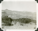 Silver Peak in the Coso Range. Creosote shrubs in foreground. Circa 1922. Coso Range just east of Sierra Nevada Range. Assumably same trip through Owens Valley as documented in surrounding photo album images. Inscription in pencil on reverse: Silver Peak. Number in black ink lower left corner refers to historic photograph numbering system: 1105. Listed in earlier catalog record Other Numbers Field: 28. Black and white, 4 x 5 inch, horizontal format. Corner mounted on photograph album page.
