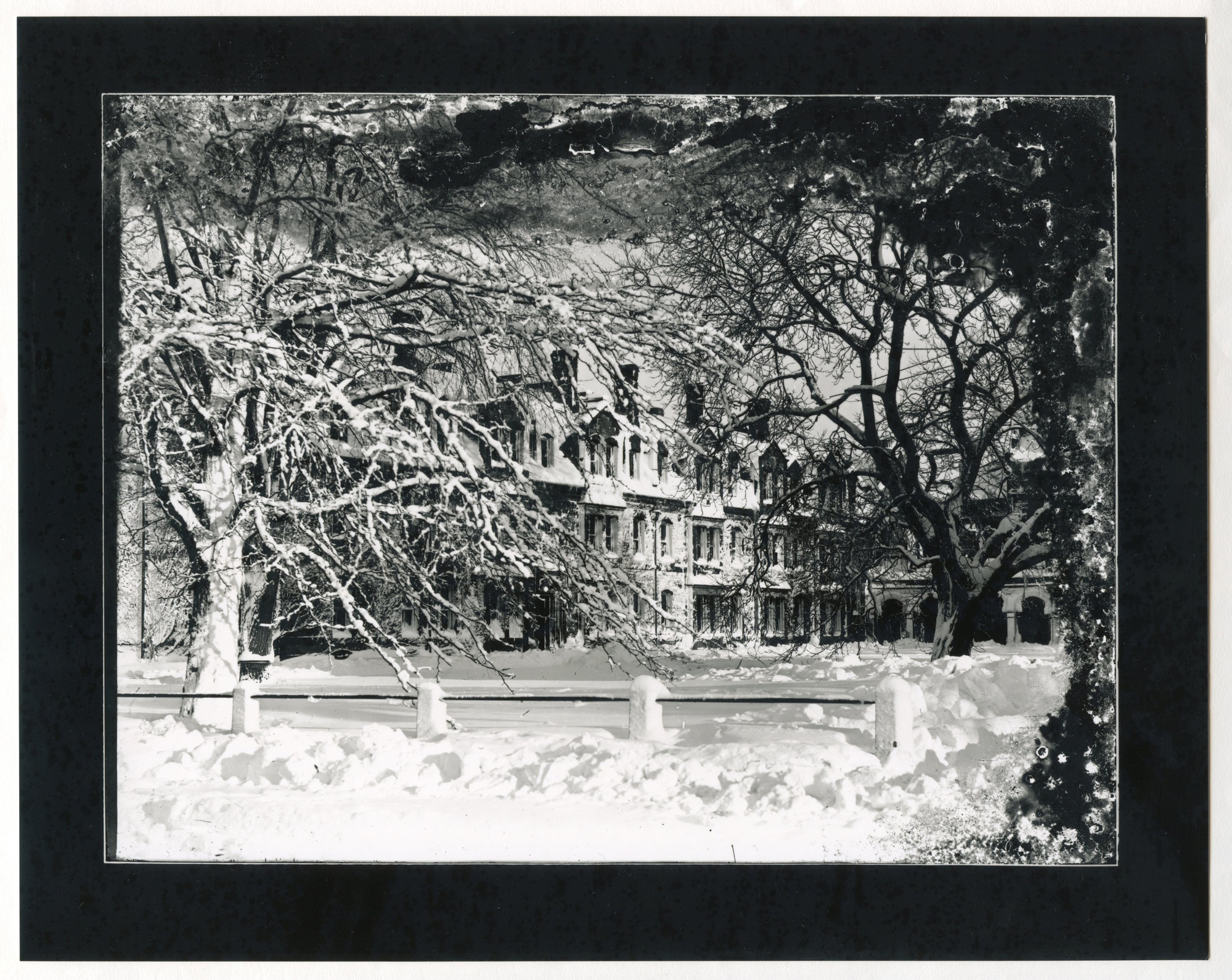 Lawrence Hall in the snow. View from Brattle Street. Notes: [1898]. The negatives box is labeled "Snow Pictures '98" and "Snow pictures / Craigie House."