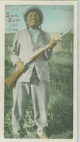 LIBI_00025_01262; A hand-tinted photograph, mounted on card, of Sun Bear (a Cheyenne), George A. Custer fight participant) at age 84 in 1927; handwritten ink notation on print; produced by Thomas Marquis, in 1927.; print, photographic [mounted on card]; Courtesy of the National Park Service, Little Bighorn Battlefield National Monument, LIBI_00025_01262, Thomas B. Marquis, "Sun Bear with a Gun, Aged 84," 1927