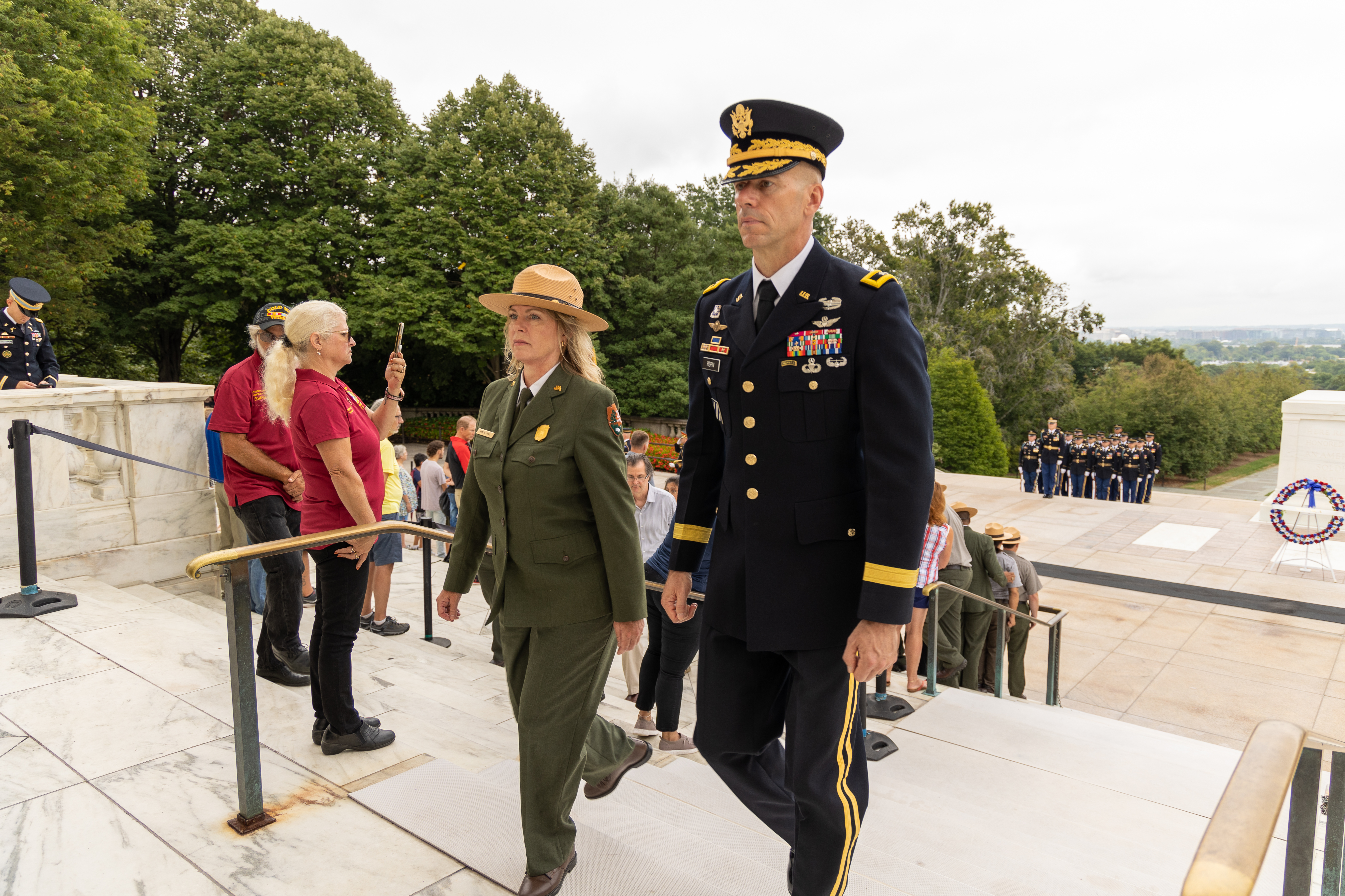 National Capital Regional Director Kym Hall and Major General Allan M. Pepin walk up the stairs after laying a wreath on the Tomb of the Unknown Soldier on September 12, 2022 at Arlington National Cemetery.