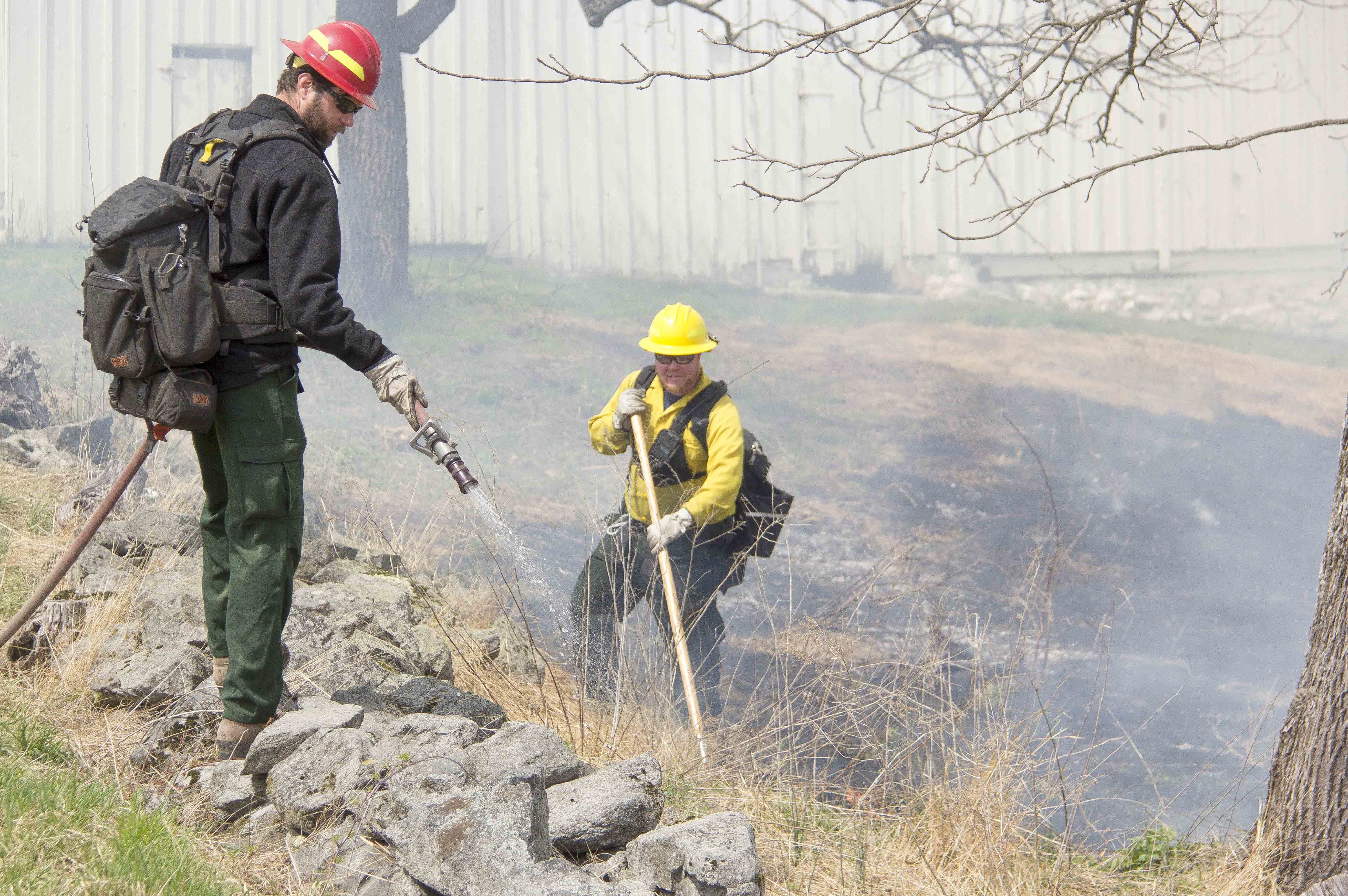 Firefighters monitor the prescribed fire and use hoses to water down the edges near a stone wall.
