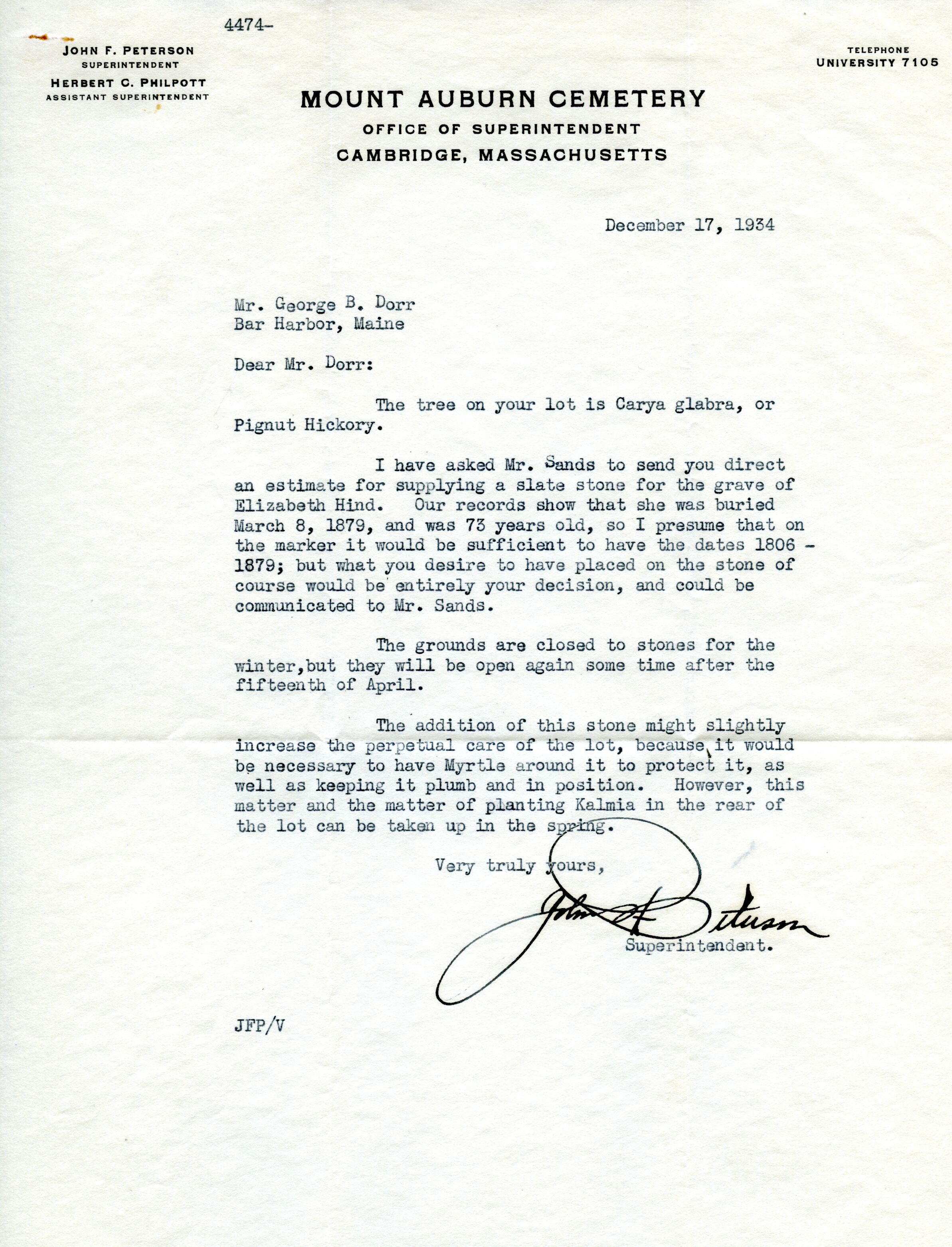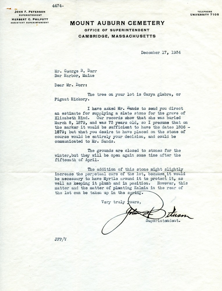 Correspondence from Mr. John F. Peterson, superintendent of Mount Auburn Cemetery in Cambridge Massachusetts, regarding the placement of vegetation and slate stone for the grave of Elizabeth Hind. Signed by John F. Peterson.