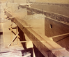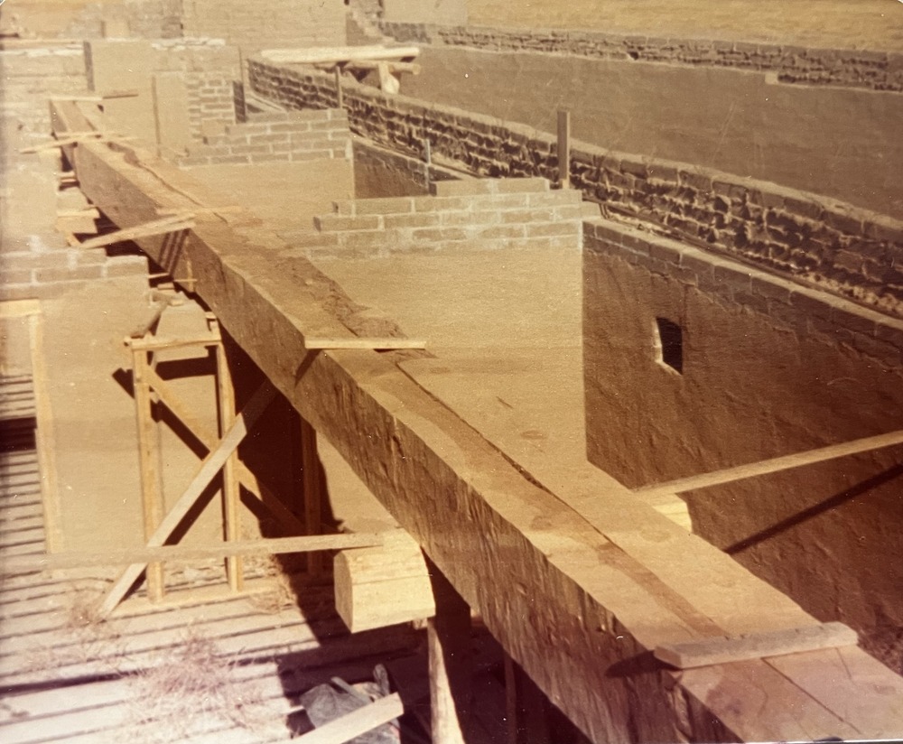 A series of long wooden beams in line are seen in the east range of rooms. The vertical support seen in the foreground is in the dining room.