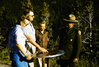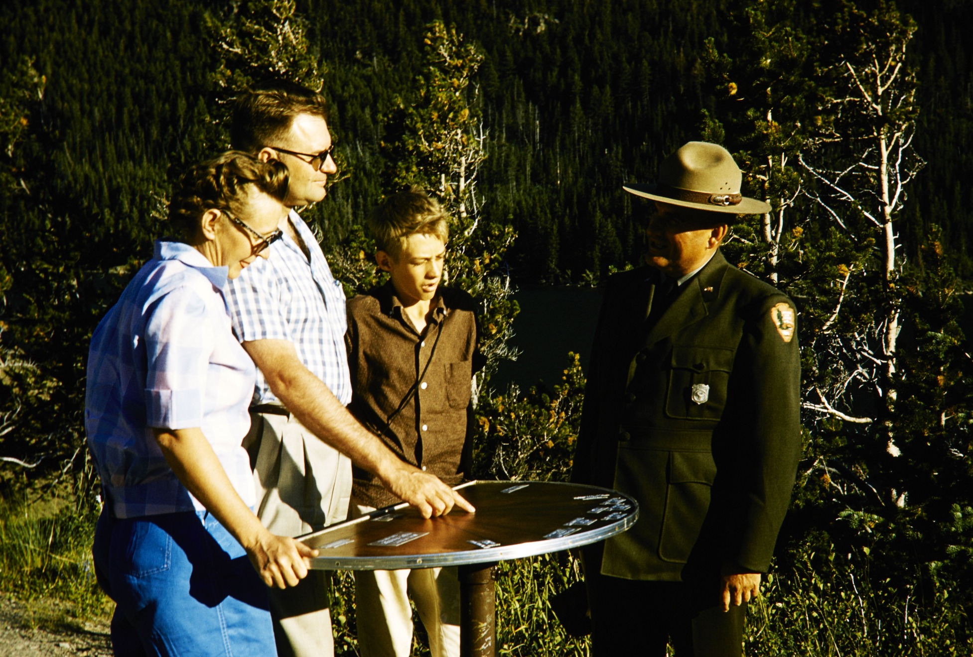 Visitors talking to NPS ranger at a view finder at Sun Point in Glacier National Park.