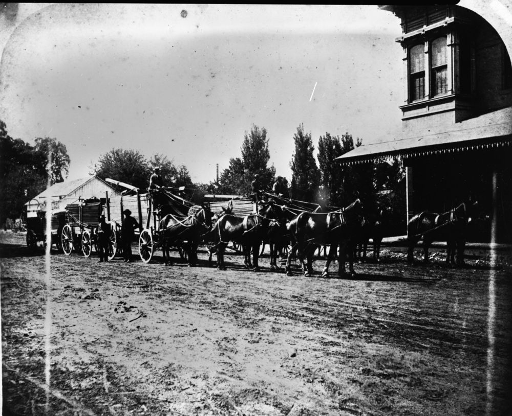 Unknown Photographer, Unknown Date, Visalia, Logging, Lumber wagons from Big Stump arriving. Smith Comstock stand near right front wheel.