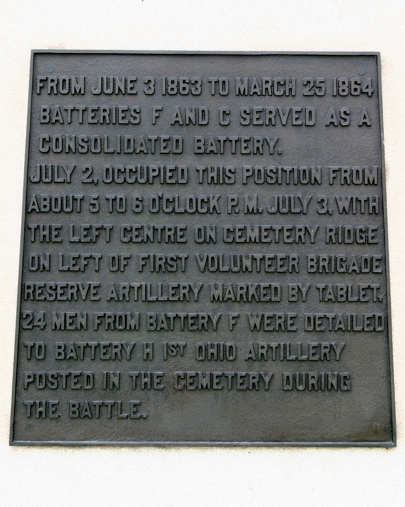 1 of 110 mns in Park honoring the services of PA commands in Gettysburg Campaign. Marks position held by battery on July 2, 1863. Located S of Wheatfield Rd at Peach Orchard. || Mn w/ 2 cannons. 6'4"x4'6", 6' high. Rough-hewn base & sculptured likeness of a cannon draped w/ cloth & surrounded w/ balls. W side of cloth is polished & incised w/ inscription. Inscription & bronze tablet of State seal on E side. 1 Cannon on E/W.