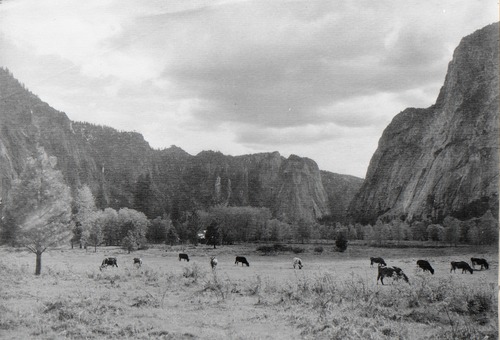 Degnan's dairy cows grazing in Leidig Meadow. Bridget and John Degnan moved to Yosemite Valley in 1884. The Degnans had a large portable oven, capable of producing 50 loaves of bread per day. As demand for Bridget's bread increasted as travel in Yosemite grew, Bridget was able to expand her production and the family's welfare, selling each loaf for 12 1/2 cents. The Degnans had their own dairy cows because that was the source of their milk during the pioneer times. The bakery (located in Old Yosemite Village near where the chapel is now) expanded as visitors asked for a glass of milk, a sandwich or something else to eat or drink. In 1900, the Degnans ordered a large brick Dutch oven that could bake more than 100 loaves of bread at a time. In 1956, the Degnans operation was moved by the couple's children to its current location in Yosemite Village. The Degnan's Deli remained a family business and independent park concessioner until the Yosemite Park & Curry Company purchased the business in 1974. The family's need to sell was forced, in part, due to bankruptcy. The expenses associated with moving and building a modern A-framed building in the new Village had been too much for the small family-run business. Copy of original photo, 3 15/16 x 9 5/8. (In the collection #17,530).