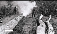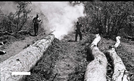 Civilian Conservation Corps (CCC) workers cutting down ponderosa for insect control on West Rim. ; ZION Museum and Archives Image 105_03_006 ; ZION 13459