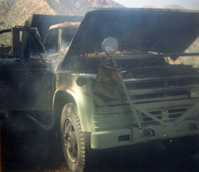 Color photo of an engine fire in a pickup. ; ZION Museum and Archives Image 107_05_01010 ; ZION 15933