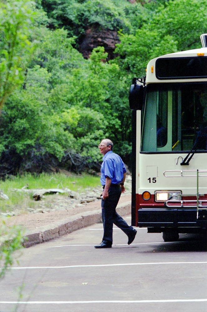 Color Photos of the official launch of the Zion shuttle system- same day as the new visitor center opening. ; ZION Museum and Archives Image 800_25_01059 ; ZION 15933