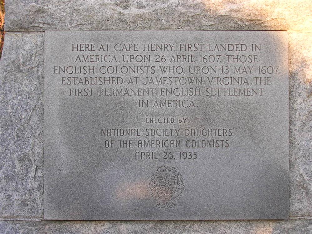 Here at Cape Henry, English colonists first landed on 1607 April 26; they later landed at Jamestown on 1607 April 26. Just off the shores on 1781 September 05 in the Battle of the Capes, French Admiral Comte deGrasse defeated a British fleet which prevented them relieving Lord Cornwallis at the Battle of Yorktown. Originally part of Princess Anne County, Virginia, the county was absorbed into the independent city of Virginia Beach. The site is within the secured area of Fort Story.