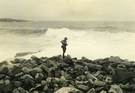 SURF HITTING AGAINST ROCKS. PARK RANGER STANDING ON SEA WALL, WORKING WITH SOMETHING IN HIS HANDS.