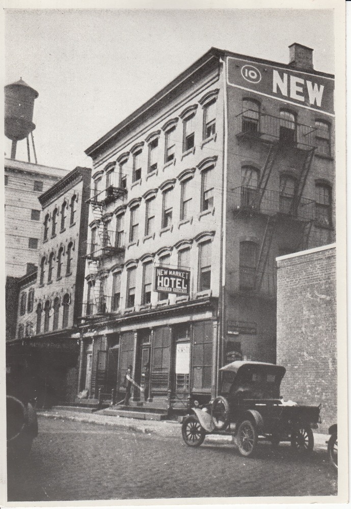 Original home of Thomas Edison's shop at 10-12 Ward St in Newark. Sign on building has text: "New Market Hotel"