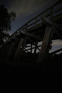 The North Bridge in Concord MA at night, under a field of stars and some light clouds.