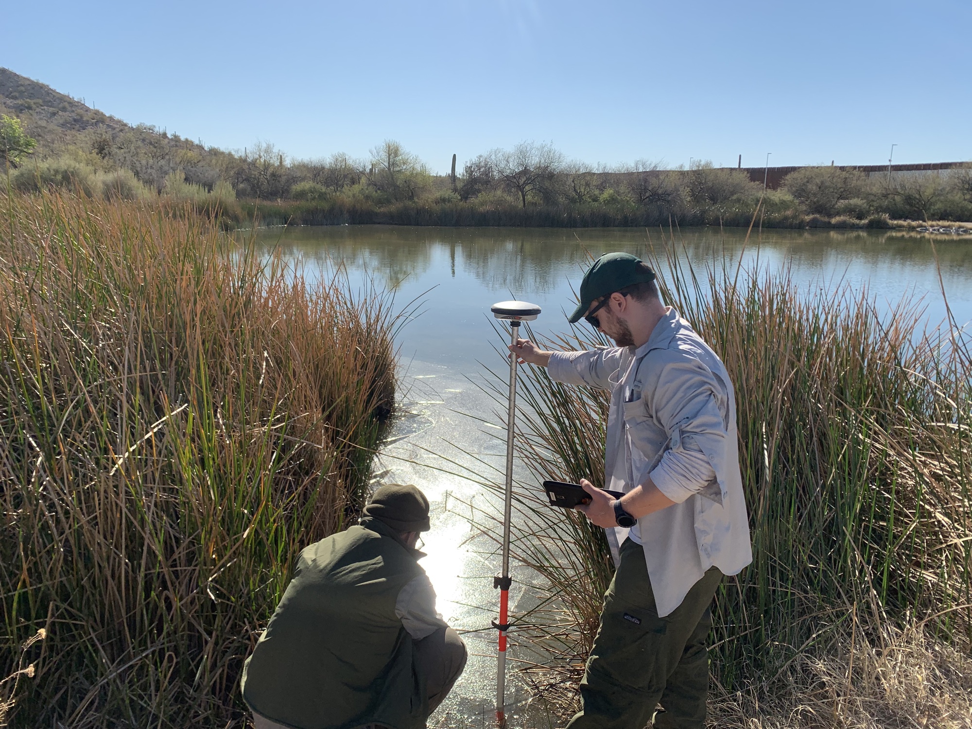Two men at the edge of a pond, saguaro in distance. One man crouches. The other holds a tall metal rod with a disc on top. The bottom of the rod is in the water.