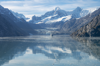 Johns Hopkins Inlet, Mounts Orville (left) and Wilbur (right), the Johns Hopkins Glacier, and a cruise ship on a calm September day.