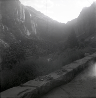 Road and rock retaining wall alongside road at the Zion-Mt. Carmel Highway tunnel. ; ZION Museum and Archives Image 002.02.01-14of16 ; ZION 15933