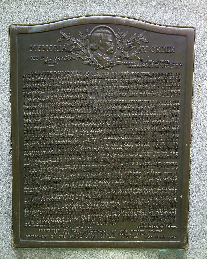 A 6'x 1'x 4' high granite slab with a polished front, quarry-faced sides, and a slightly curving top. Two bronze plaques contain the text of Lincoln's Gettysburg address (left) and General John A. Logan's Memorial Day Order (right).