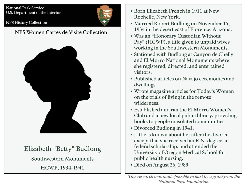 Modern digital carte-de-visite (CdV) with biographical sketch for Elizabeth "Betty" Budlong.