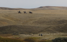 Three horseback riders on distant golden hills, two people in foreground