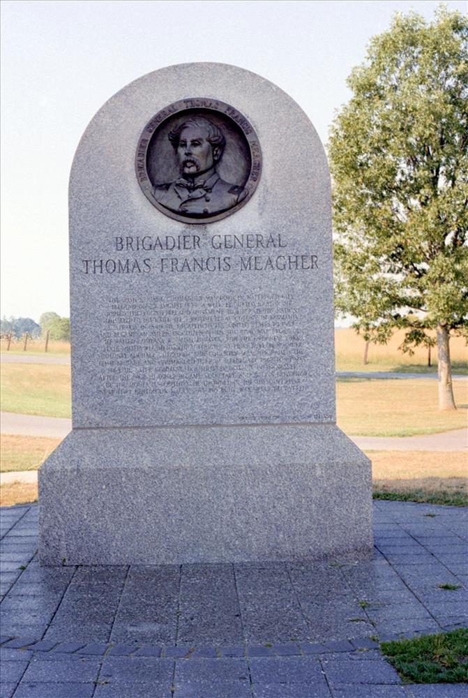 IRISH || Monument consists of large block of County Wicklow (Ireland) granite with rounded top on which is bas-relief panel showing 69th NY color guard in action on front and rondel bas-relief bust of Gen. Meagher on reverse. Adjacent to observation tower. || Built in 1996; sculpted by Ron Tunison
