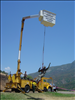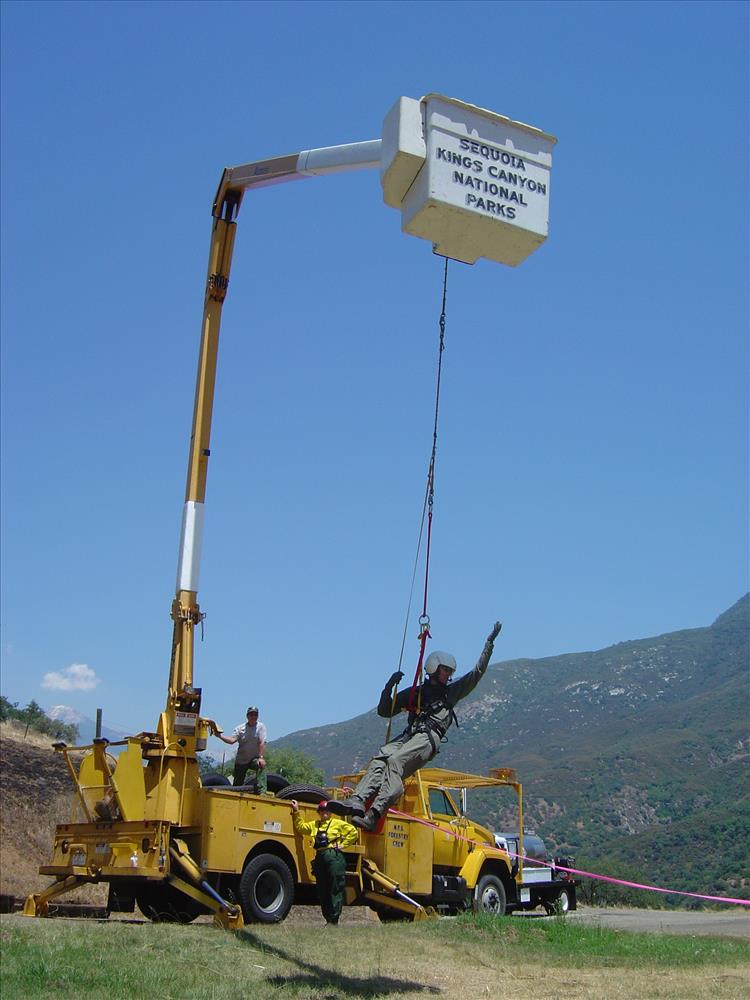 During emergency helitack operations, it is occasionally necessary to perform external transport of patient and/or park personnel a short distance to a good landing site where internal loading can take place. These images show training exercises using the equipment used to accomplish these operations. The short-haul program was initiated in Sequoia and Kings Canyon National Parks (SEKI) in 2003, and became fully operational in the summer of 2004. Training, with participation by SEKI and Yosemite NP helitack crew members, is given at Ash Mountain helibase in the early summer.